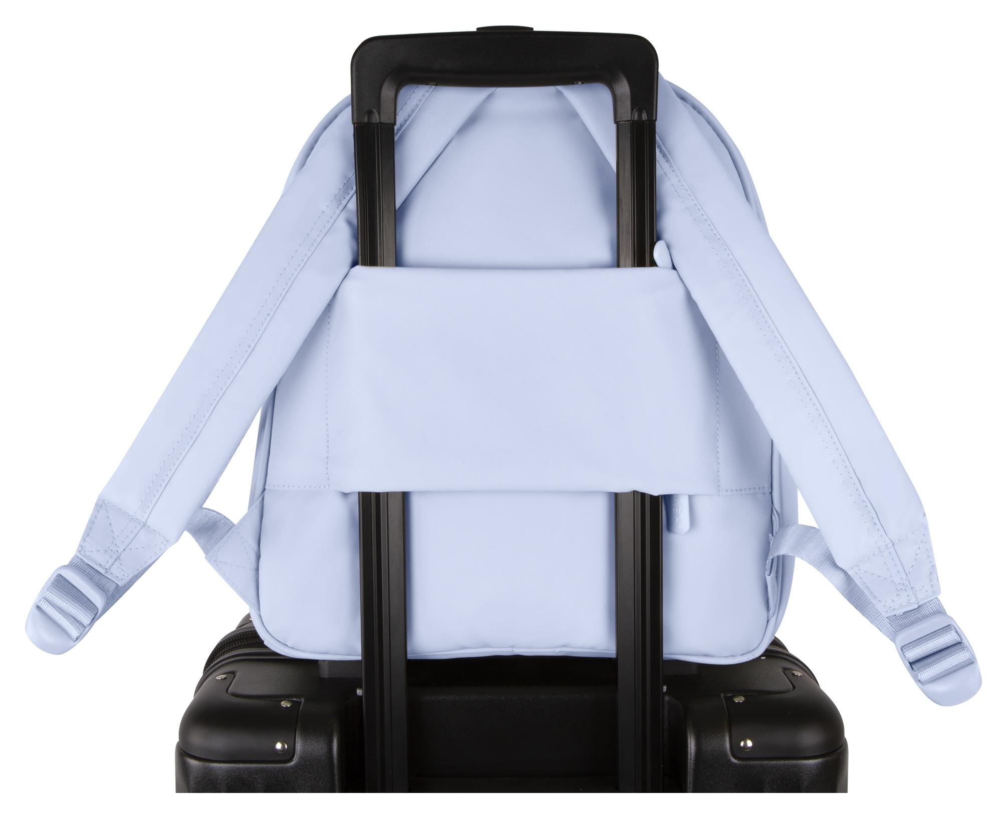 zadné vrecko funguje po rozopnutí zipsov ako popruh umožňujúci nasadenie batohu na výsuvnú rukoväť kufra