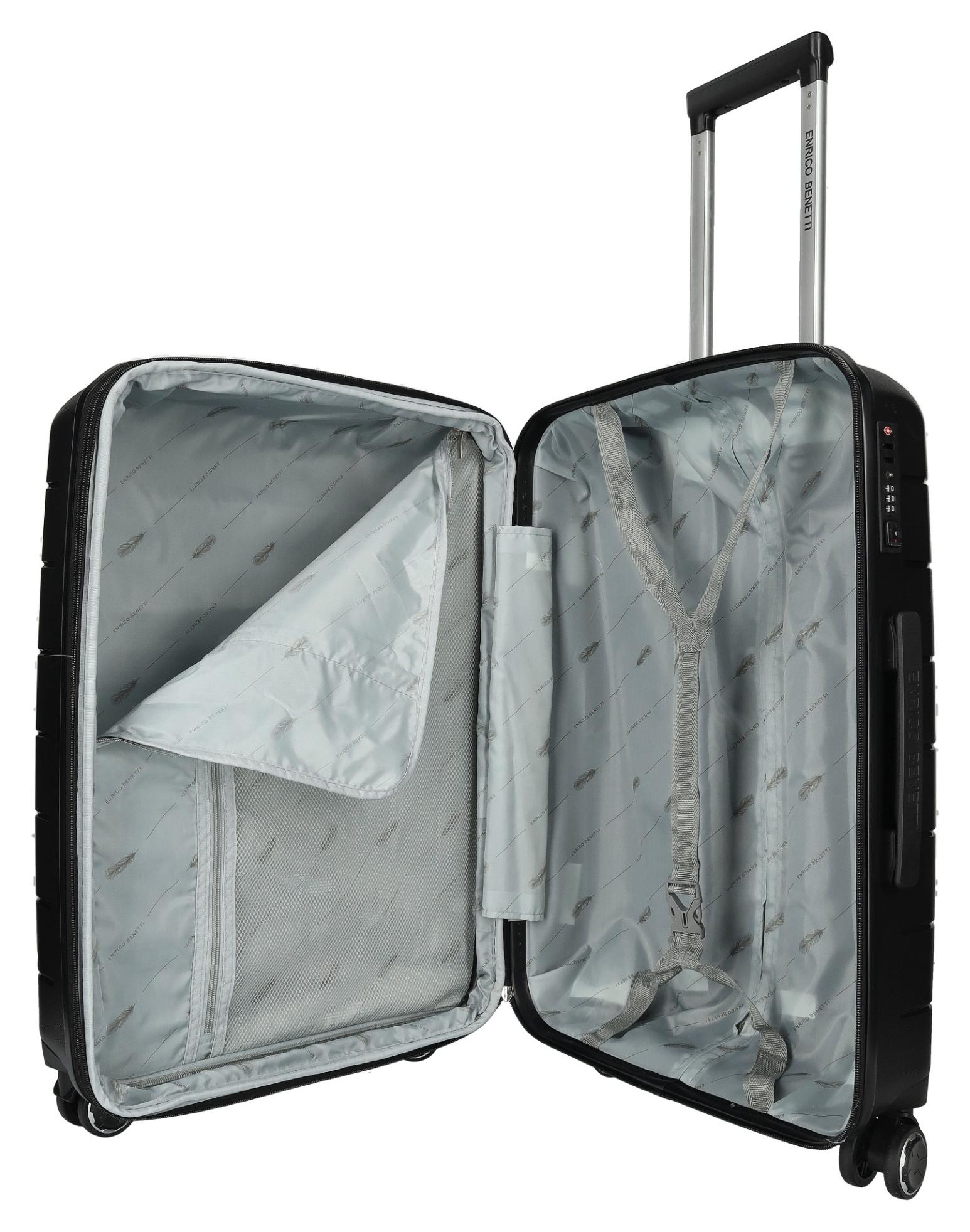 Vykročte v ústrety cestovateľským zážitkom s elegantným kufrom Enrico Benetti Montréal. Kvalitný polypropylén prepožičiava kufru tie najlepšie vlastnosti, ako je odolnosť, nízka hmotnosť a dlhá životnosť. Kufor je vybavený TSA zámkom, ktorý sa stáva pri leteckom cestovaní stále väčším benefitom – ochráni obsah kufra pred zlodejmi, zároveň ale umožní prehliadku batožiny letiskovej kontrole. Stredný kufor M disponuje expandérom, takže už pri balení nebudete musieť robiť kompromisy a z ciest si budete môcť doviezť aj nejaký suvenír. Vnútorná prepážka s vreckom a kompresné popruhy umožnia prehľadnú organizáciu a udržia vo vašich veciach poriadok.