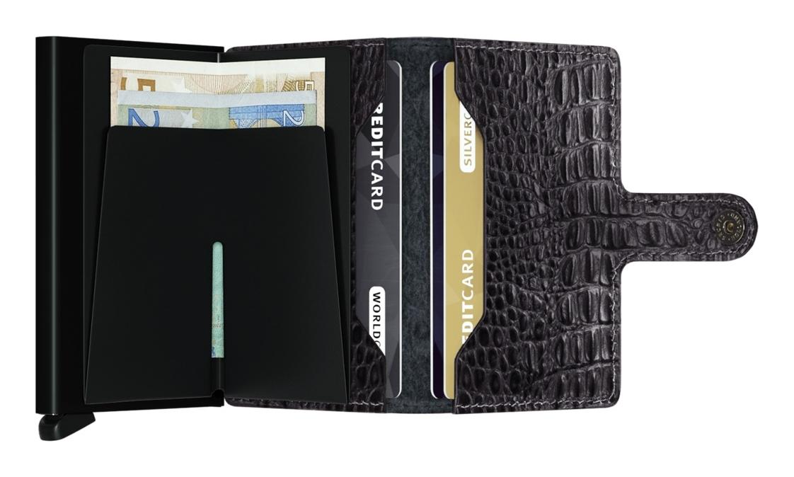 Miniwallet je všestranná peňaženka, ktorá je kompaktná čo do veľkosti, avšak prekvapí úložnou kapacitou. Patentovaný mechanizmus umožňuje okamžitý prístup k vašim kartám vďaka jednému jednoduchému pohybu. Hliníková vrstva chráni karty nielen pred ohýbaním či prasknutím, ale tiež pred nežiaducou bezdrôtovou komunikáciou. – priestor pre 4 embosované či 6 plochých kariet – oddiel pre 4 extra karty – priestor pre bankovky, vizitky aj účtenky – vyrobené z európskej hovädzej usne